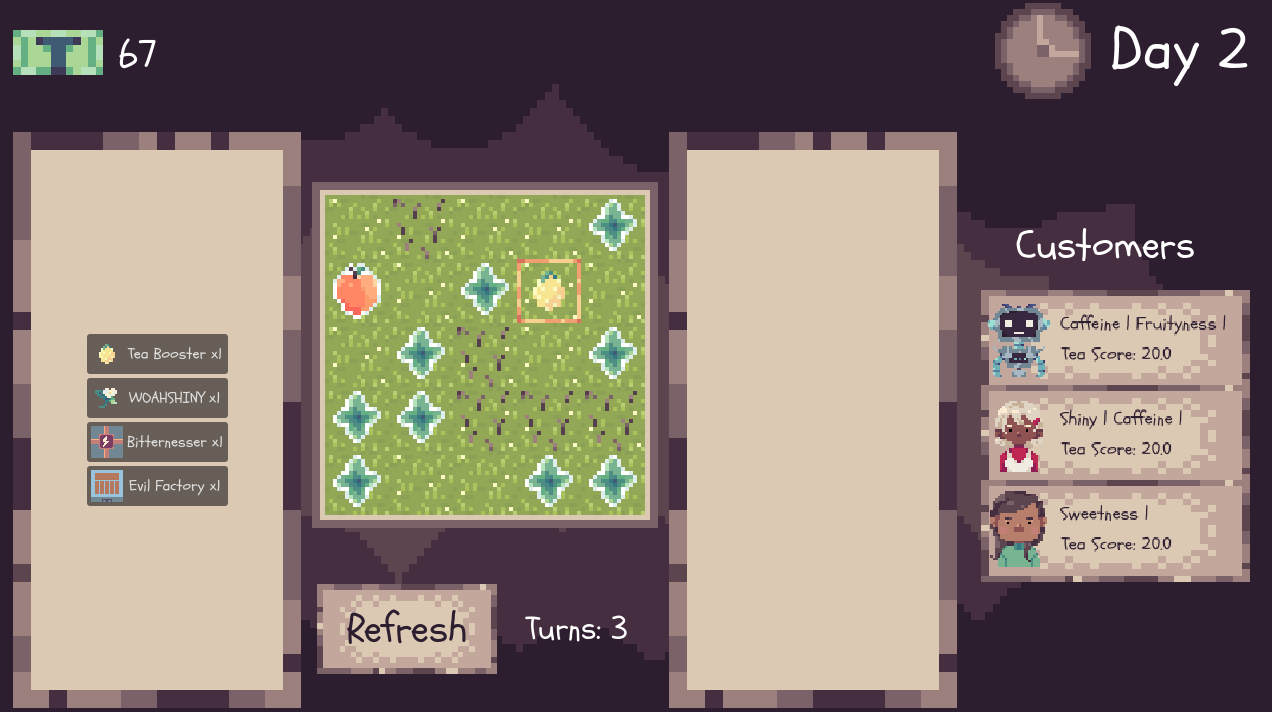 Refresh the grid to make tea to give to your customers! Once every customer has been given some tea you can progress to the next day. Before each day, you can purchase buildings that, when placed on the grid, have many different effects to make your tea tastier.